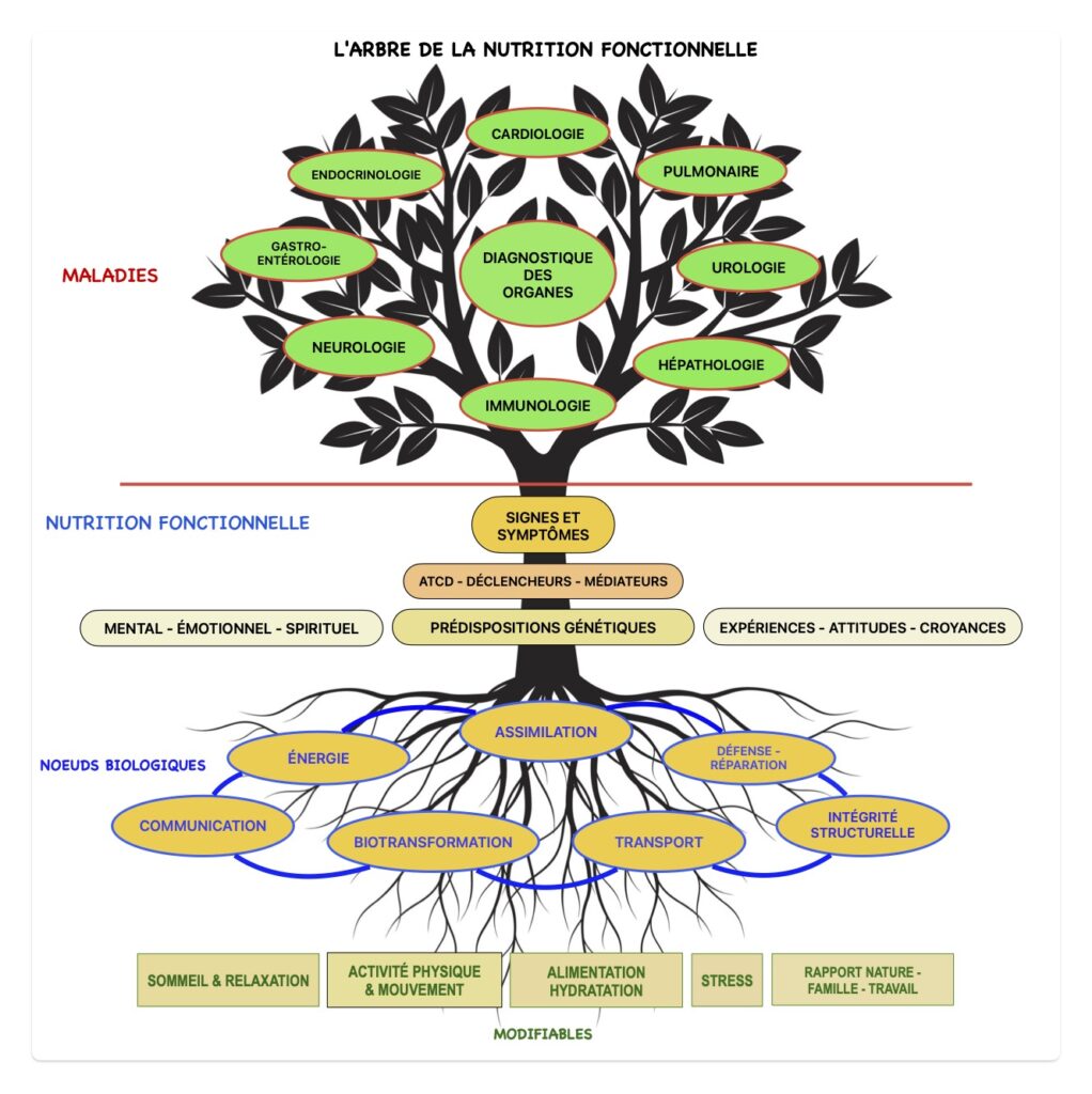 La nutrition fonctionnelle est une approche nutritionnelle centrée sur la personne et non sur la maladie (réservée aux médecins). Elle vise à identifier et à améliorer les causes sous-jacentes des déséquilibres ou des problèmes de santé chroniques, plutôt que de se limiter aux soulagement des symptômes. Elle prend en compte la biochimie, le mode de vie et les facteurs environnementaux propres à chacun, afin d’élaborer des recommandations nutritionnelles et de mode de vie personnalisées qui favorisent une santé et un bien-être optimal. En nutrition fonctionnelle, on analyse vos signes et symptômes, votre mode de vie, vos antécédents personnels et familiaux, vos prédispositions génétiques (si disponibles), vos déclencheurs (maladies, cures d’antibiotiques, exposition à des toxines, traumatismes etc.) ainsi que vos analyses biologiques (si disponibles et idéalement des tests fonctionnels). On tient aussi compte de votre bien-être mental et émotionnel pour déterminer quels systèmes biochimiques (les « noeuds biologiques ») sont en déséquilibres. Grâce à des facteurs modifiables (alimentation, hydratation, sommeil et relaxation, activité physique, gestion du stress, relation à la nature, à la famille et au travail), des recommandations personnalisées vous sont proposées pour aider à rééquilibrer les systèmes en difficulté et offrir des solutions durables.